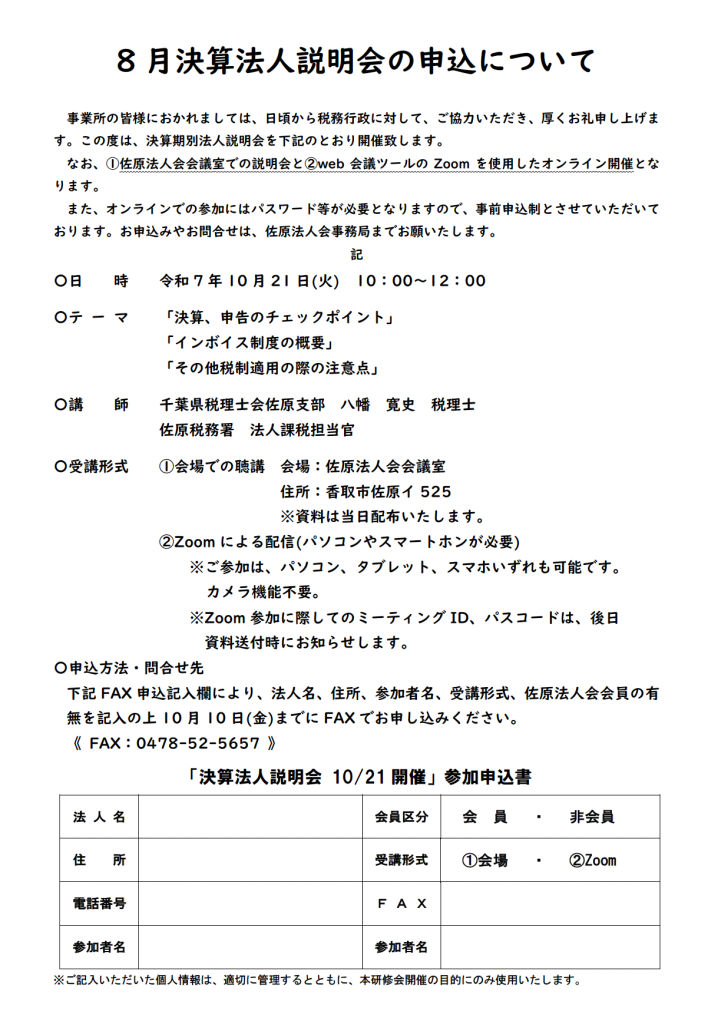 FAX(0478-52-5657)にて、法人会事務局宛て、こちら(8月決算法人説明会)のPDFの申込書に詳細ご記入の上お申し込み下さい。