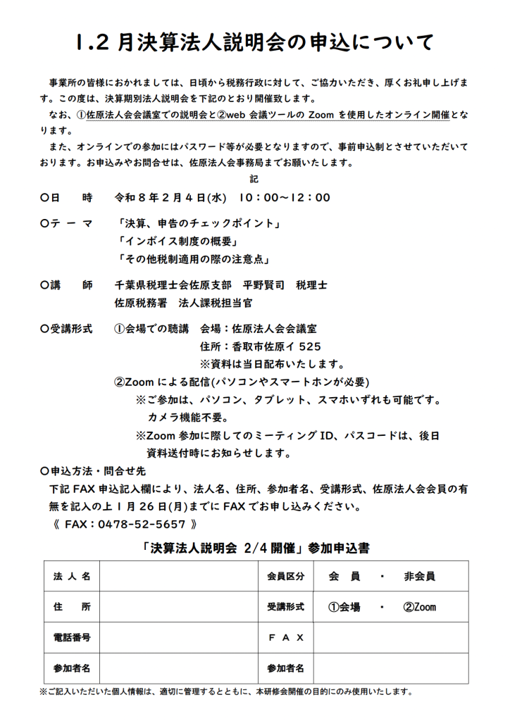 なお、①佐原法人会会議室での説明会と②web会議ツールのZoomを使用したオンライン開催となります。
