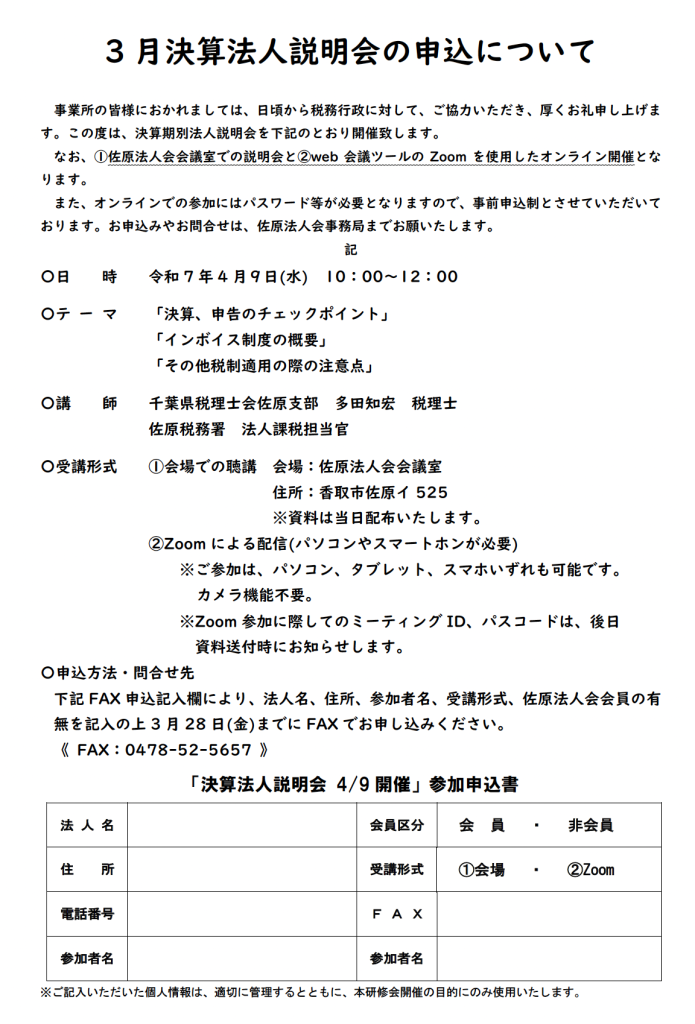 FAX(0478-52-5657)にて、法人会事務局宛て、こちら(3月決算法人説明会)のPDFの申込書に詳細ご記入の上お申し込み下さい。
